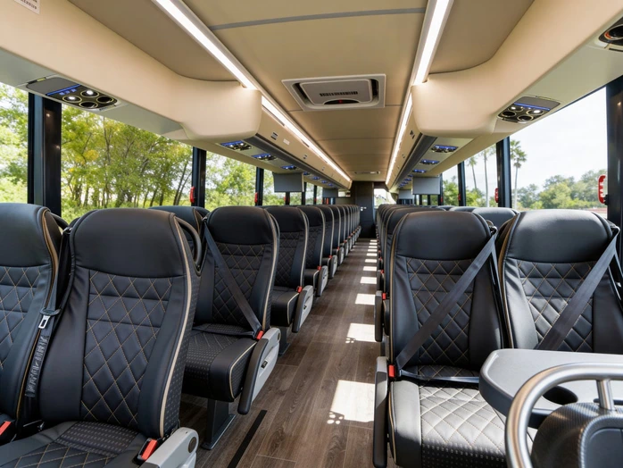 When you book a San Marcos Charter Bus vehicle, you'll get premium amenities that make every ride comfortable. Store your luggage in overhead compartments or undercarriage bays, keep devices charged with onboard power outlets, and stream videos using fast WiFi while you watch the road ahead with our quick quote form. Every seat on your San Marcos bus rental has a seatbelt for safety, and you can relax knowing the cabin maintains a cool temperature even during Texas heatwaves. Enjoy entertainment options like AUX/Bluetooth sound systems and TVs, and stay connected with PA systems-perfect for long trips or special events.